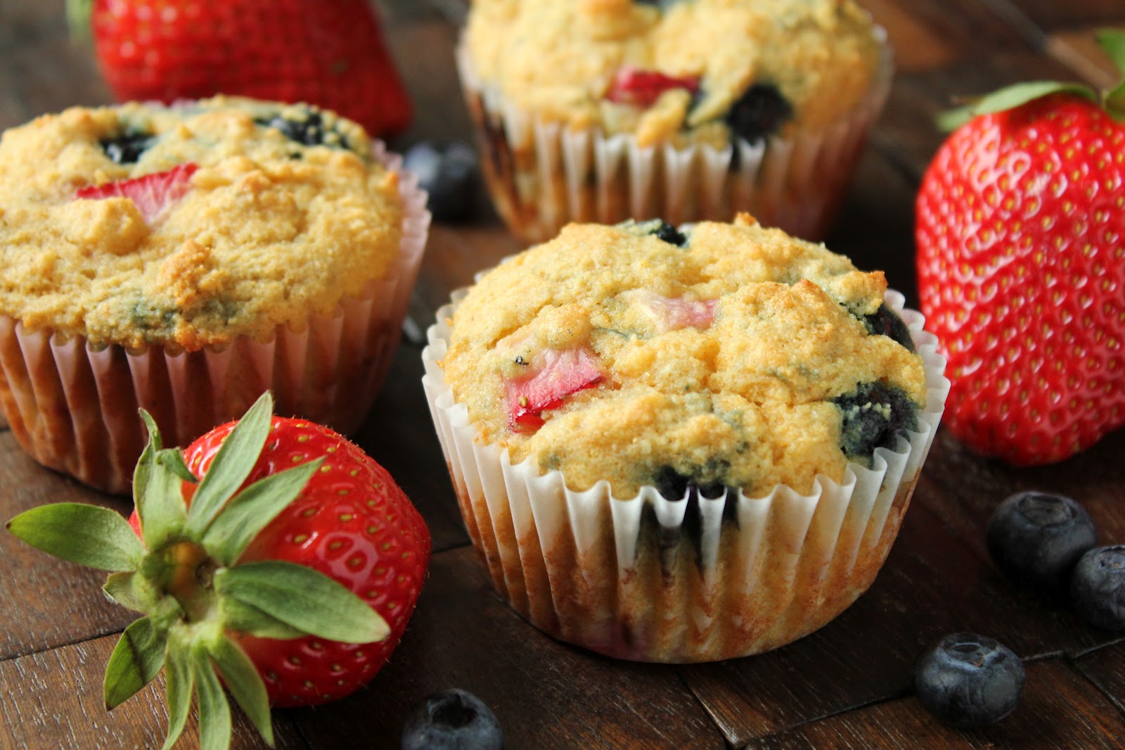 Well, I put my adapting skills to work and put a little spin on these muffins. I’ve always loved cornbread served with maple syrup, so I decided to sub the honey with pure maple syrup. Since I’m trying to reduce my sugar intake, I also reduced the amount of syrup. Maple syrup may also be more easily tolerated for those with fructose malabsorption since it has less fructose than honey. Just don’t eat too much! If I have blueberries in the fridge, I usually have strawberries too. So I threw some chopped strawberries in. With all the berries in these muffins, they are plenty sweet, even with less syrup. I can tolerate berries fine, as long as I don’t eat a whole bowl-full. The few berries that are in each muffin are not an issue for me. I hope they aren’t for you either because berries are so good for you! Berries are actually low in sugar compared to other fruits and are full of antioxidants.