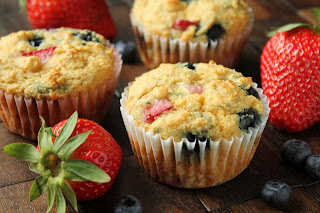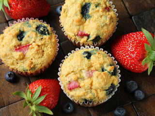 2. In a large bowl, combine the dry ingredients and blend well. Add the wet ingredients and stir until thoroughly combined. Fold in the blueberries and strawberries.