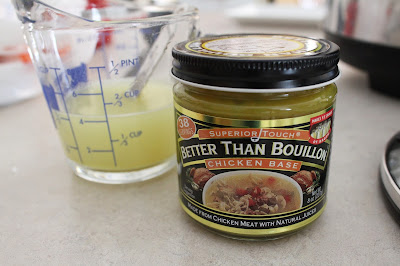 Add the chicken broth. For soups I like to use homemade broth, but for when I only need a small amount of chicken broth, I like to use Better than Bouillon chicken base. Just heat 1/2 cup water in a microwave and stir in 1/2 teaspoon base.