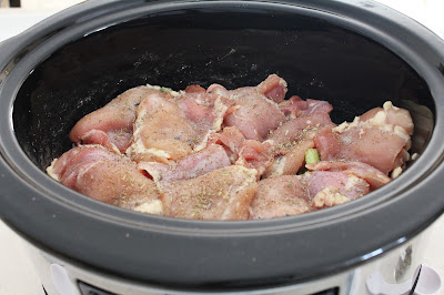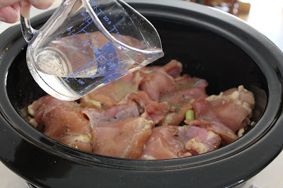 Place the chicken thighs or breasts on top of the carrots and celery and sprinkle with Herbes de Provence and salt and pepper. I like to use chicken thighs because they to not dry out as much as breasts do in the slow cooker.