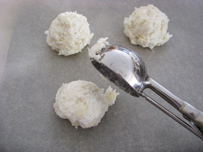 Drop the biscuits by large spoonfuls onto the cookie sheet. I found my cupcake scoop works really well for this purpose.