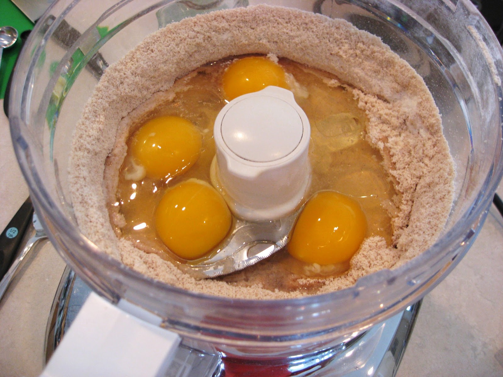 3. Add the eggs, oil, glucose syrup (or honey) and vinegar. Pulse until well blended and smooth.