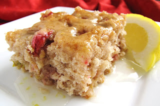 The other two rhubarb recipes I made were both from Allrecipes.com and they were both fantastic! I love rhubarb and have since I was a little girl. My mom grew it her garden and would make her famous Rhubarb Meringue Pie. The first was a cake: Rhubarb Spice Cake with Lemon Sauce. I had one piece and sent the rest with my husband to his work. It got rave reviews from his coworkers. They were pleasantly surprised at the flavor combination and thought it had just the right amount of lemon. The only thing I didn’t like about the recipe was that it made too much lemon sauce and ended up throwing a lot of it out. I would recommend halving the sauce.